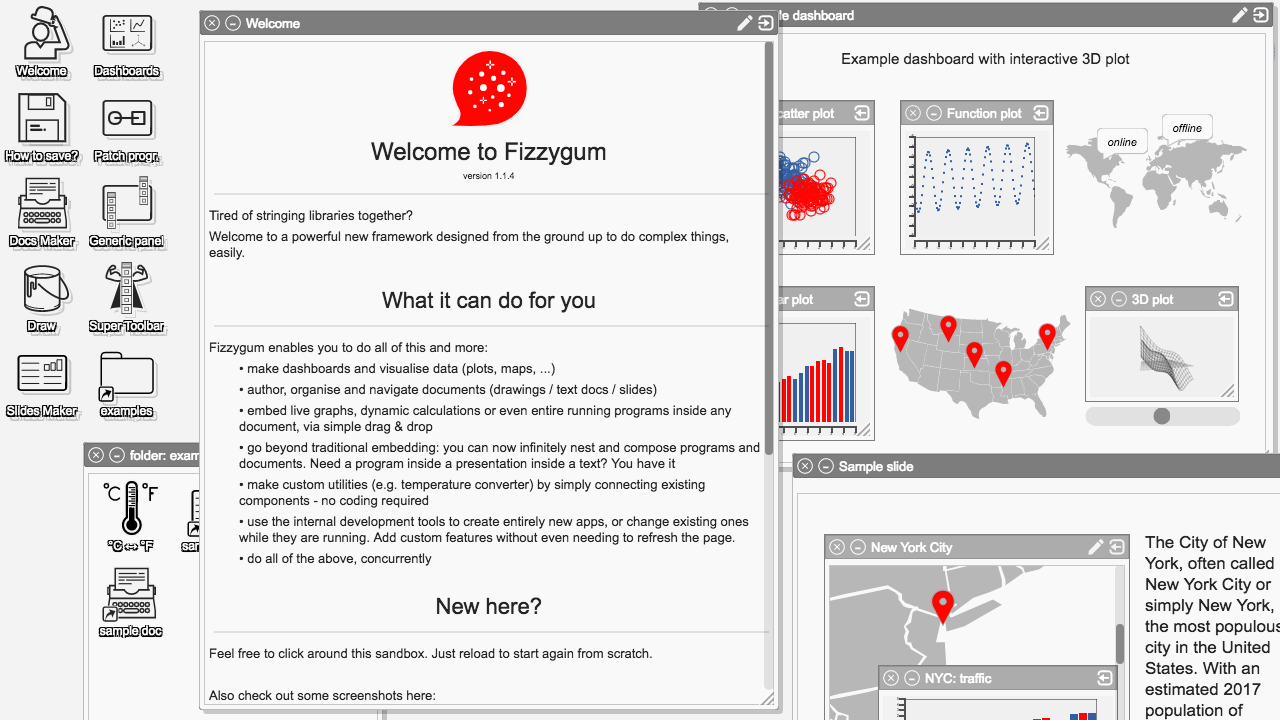 Fizzygum is a new web framework, an entire platform really, designed from the ground up to do complex things easily. Things like: live documents, complex apps, complex sets of apps, or even entire custom environments.