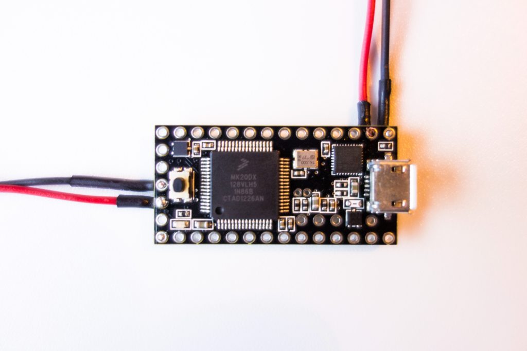 The idea is to put a “Teensy” board under the display. The Teensy drives a CNY74-2H optocoupler to close the shutter circuit at some interval. Here is the Teensy 3.0 board. The top wires drive the optocoupler (through a resistor so not to fry it), the left wires will go to the battery (through a switch).