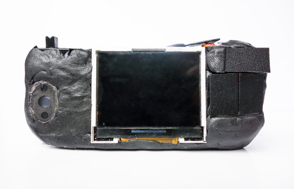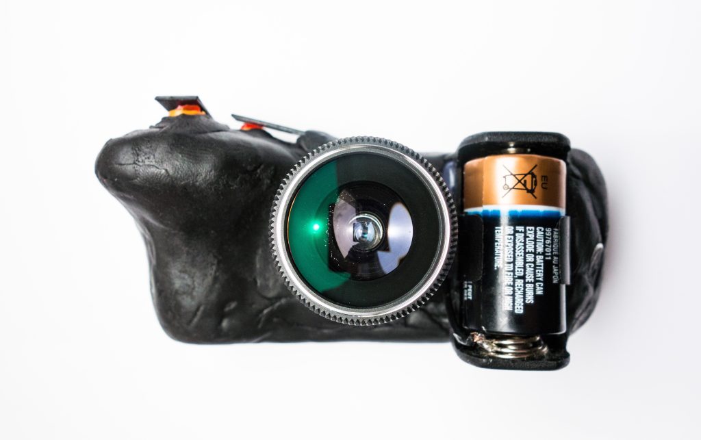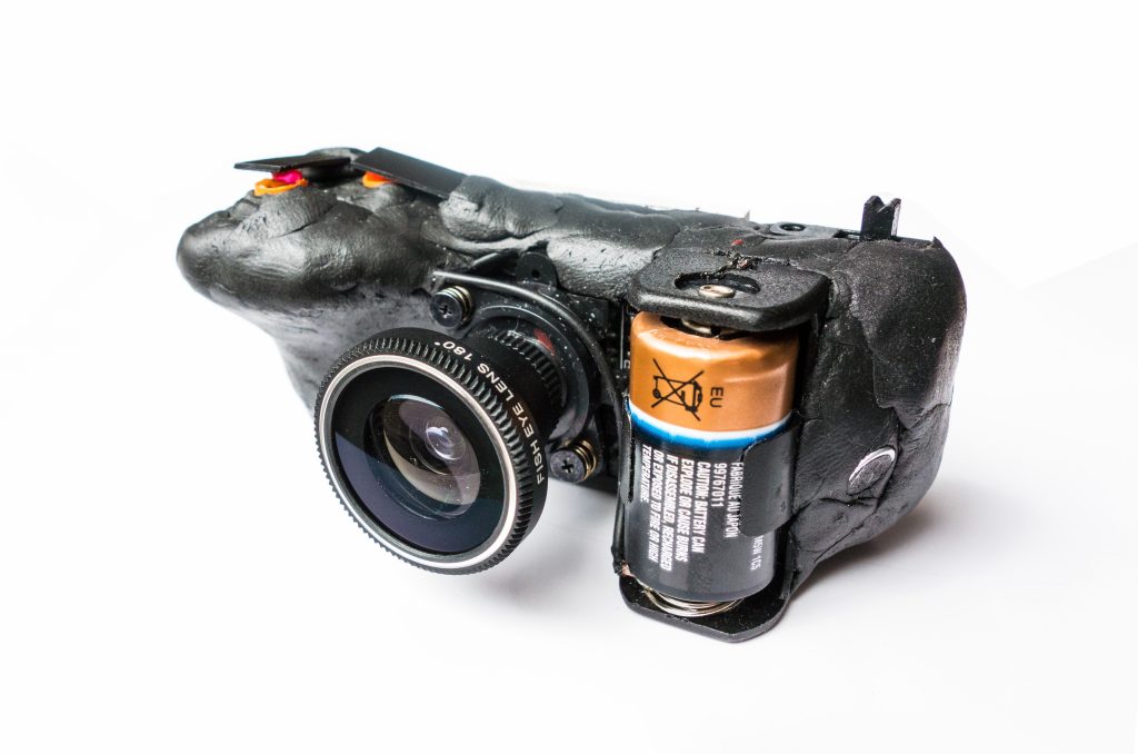 The battery holder is replaced by a new one and Sugru is applied in abundance. Also note the switch that turns on and off the timelapse (top left of the camera).