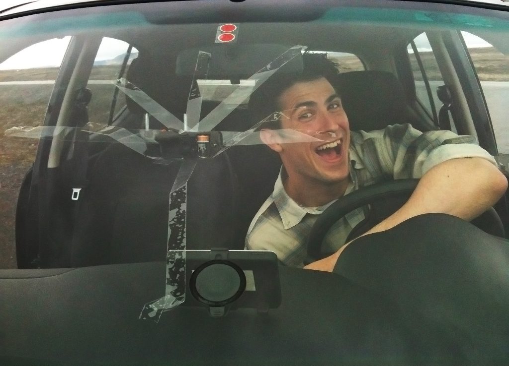 So now one can just strap the camera on the windshield in a very classy and toooootally unobtrusive way and take some timelapse videos. You can barely see the camera here. I don’t know if you can see it.
