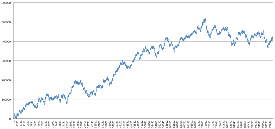 Indeed there is such a curve, but it’s not really a curve, it’s more like a random walk: the inventory size in such random process can be arbitrarily high (although with correspondingly low probability). This is the graph of the inventory size in a simplified simulation where there are two robots (instead of 5) and robots can only pick up 1 or 2 tokens (instead of 1 to 6). This reduced simulation obviously suffers no loss of generality compared to the original, but it’s quicker to run over 100 billion rounds. (the source code for this reduced simulation is also in the repo here).