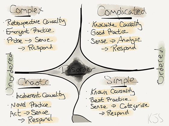 This is called something like the “Cynefin model” (no it’s not pronounced like that) but let’s call it “hemorrhoids” here, because no one knows what Cynefin is but hemorrhoids are indeed well known and at least they carry some information, if anything in relation to the looks of the quadrants.
